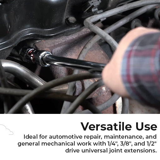 ✅Versatile Compatibility: The set includes a 1/4-Inch x 6-Inch, 3/8-Inch x 8-Inch, and 1/2-Inch x 10-Inch drive U-Joints, compatible with all standard 1/4", 3/8", and 1/2" sockets. Knurled grips provide a firm hold, and the detent ball and notch system keeps sockets securely in place, preventing slips, stripped fasteners, and wasted time.
