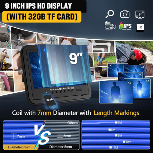 ✅ Clear and Wide Viewing: The camera delivers a sharp 1000TVL resolution with a 140° wide viewing angle for greater coverage inside pipes. Paired with a large 9-inch HD LCD screen and 12 adjustable LED lights, it ensures bright, detailed visuals even in dark or murky environments.