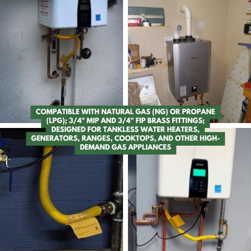 A: The Universal Flexible Gas Connector is designed for tankless water heaters and other high-demand gas appliances that use natural gas or propane. It's compatible with generators, ranges, cooktops, and other gas-powered equipment requiring reliable, flexible connections. The connector features 3/4" MIP and 3/4" FIP brass fittings, making it universally compatible with most standard gas line connections found in residential and commercial applications.